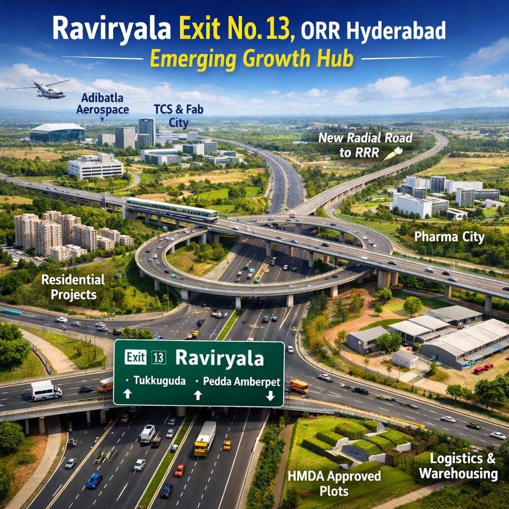 Exit No. 13 at Raviryala is transforming rapidly from an overlooked junction into a cornerstone of Hyderabad’s southern development — powered by connectivity, strategic infrastructure, and urban expansion. Its proximity to industrial zones, future radial road networks, emerging amenities, and real estate growth momentum position it as one of the city’s high-potential growth hubs in the years to come.
